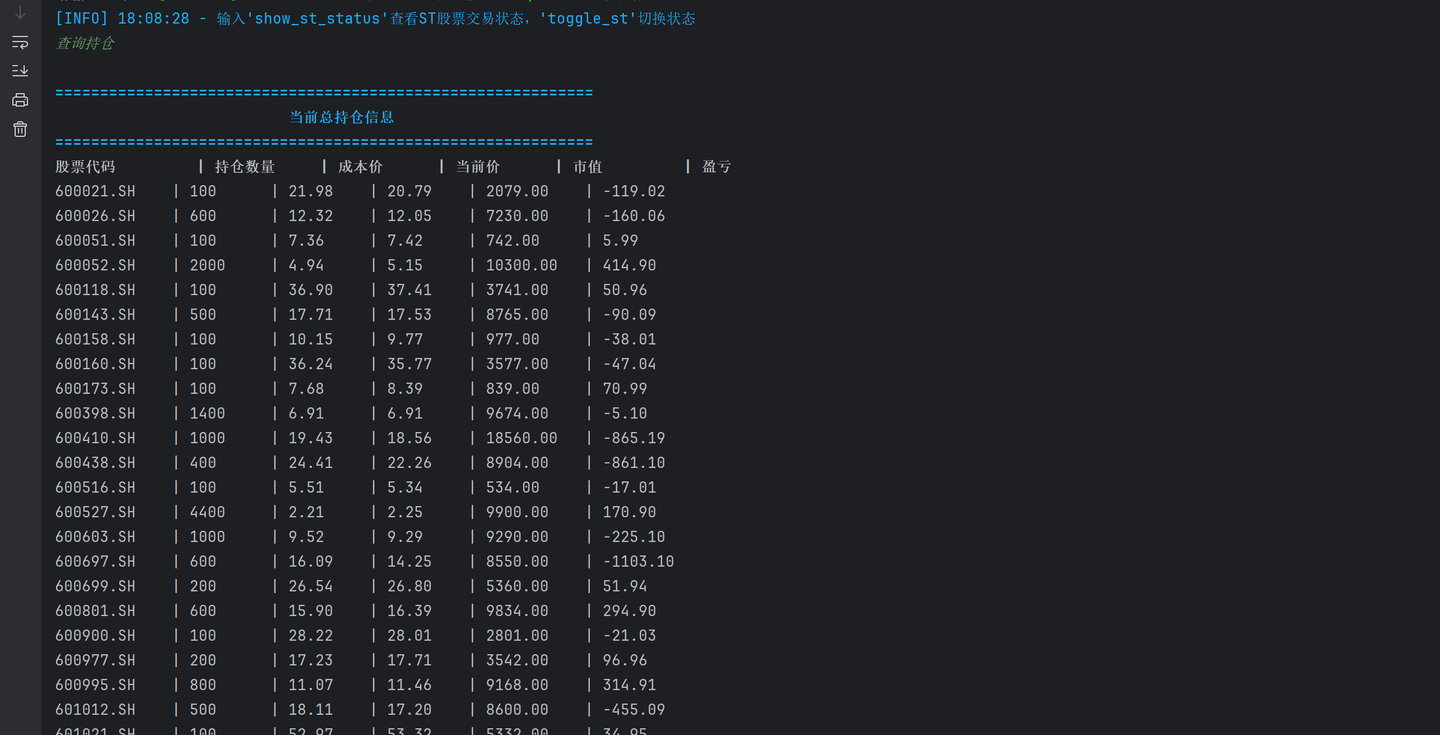 查持仓不用记笔记:输入 “查询持仓”,每只股的成本价、当前价、盈亏都直接显,总市值和总盈亏也自动算好,不用开 Excel 对账;