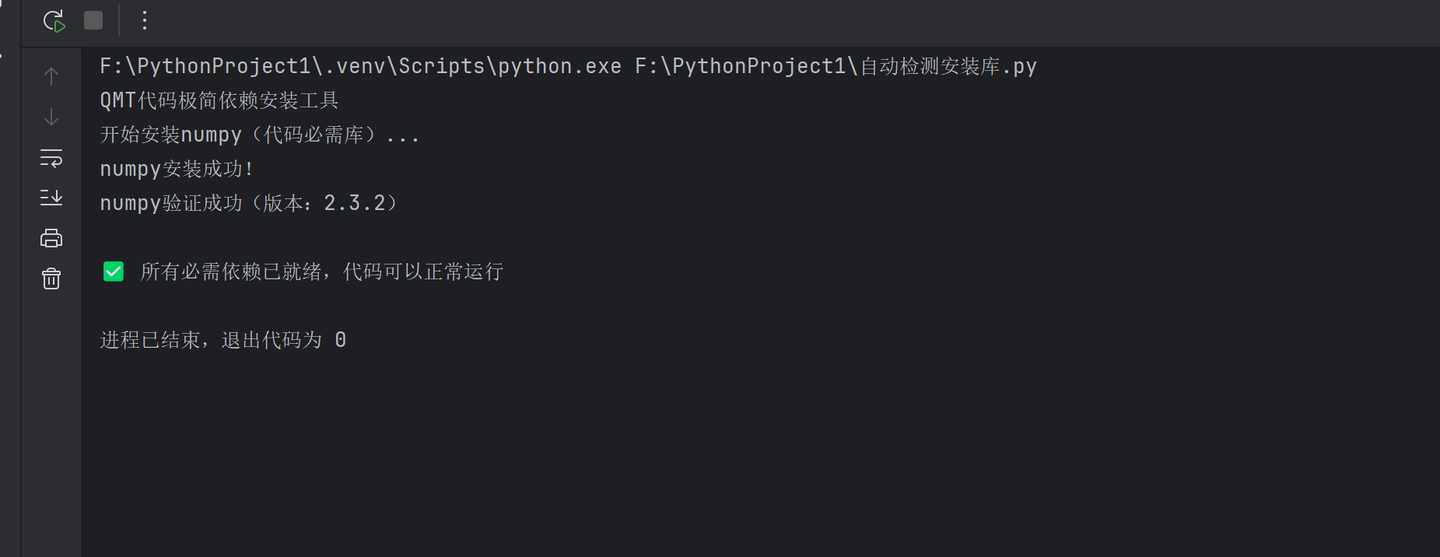 打开我给的qmt_trader.py,工具会自动检查缺的库(numpy、xtquant),缺啥自动装,不用输命令。