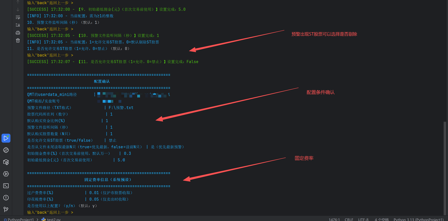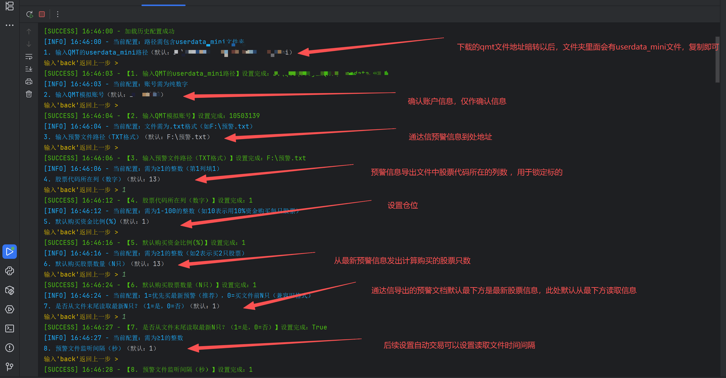 配置一次就够:第一次用会引导填 QMT 路径、预警文件路径、账号,填完自动保存,下次打开直接用,不用重复输;