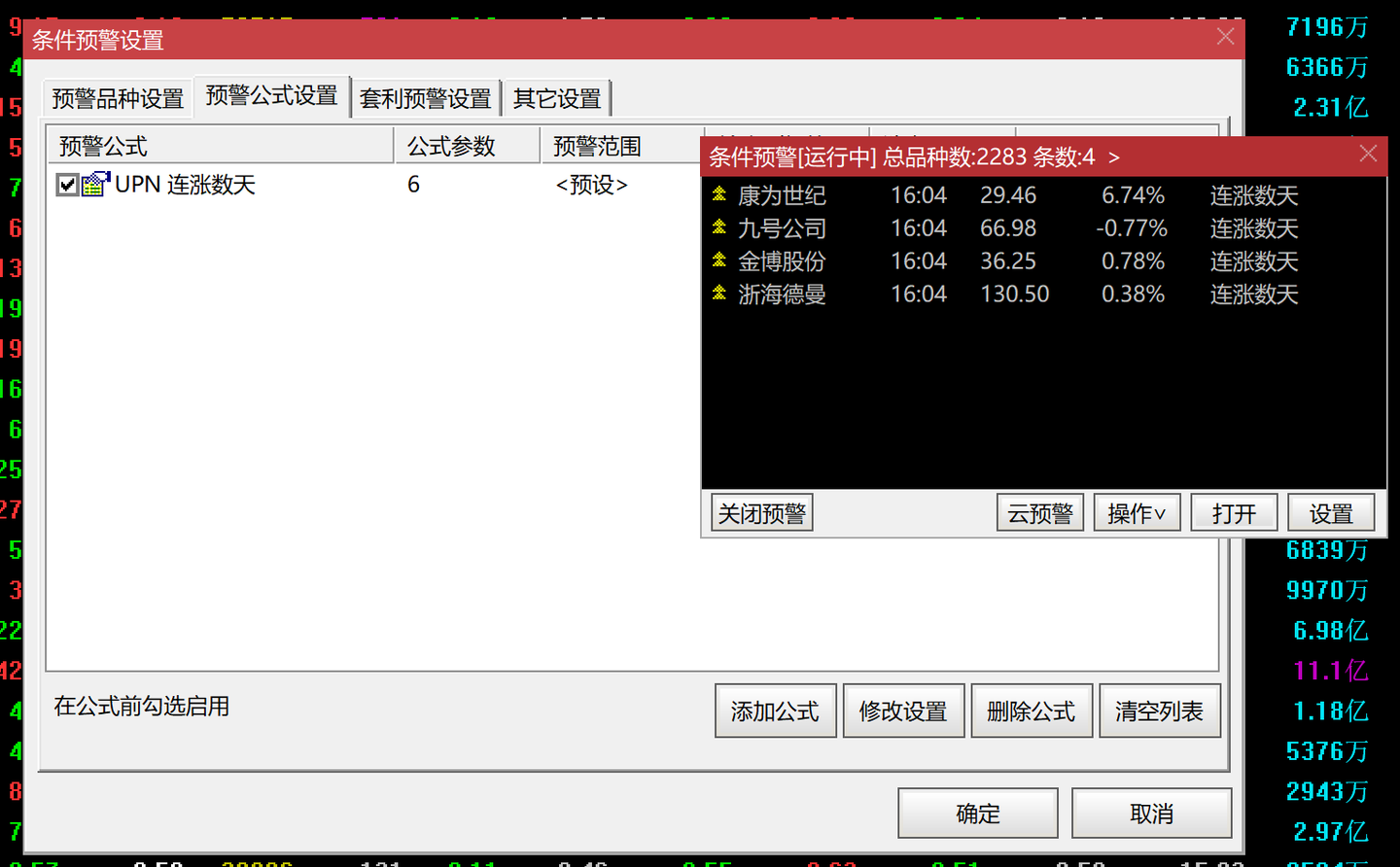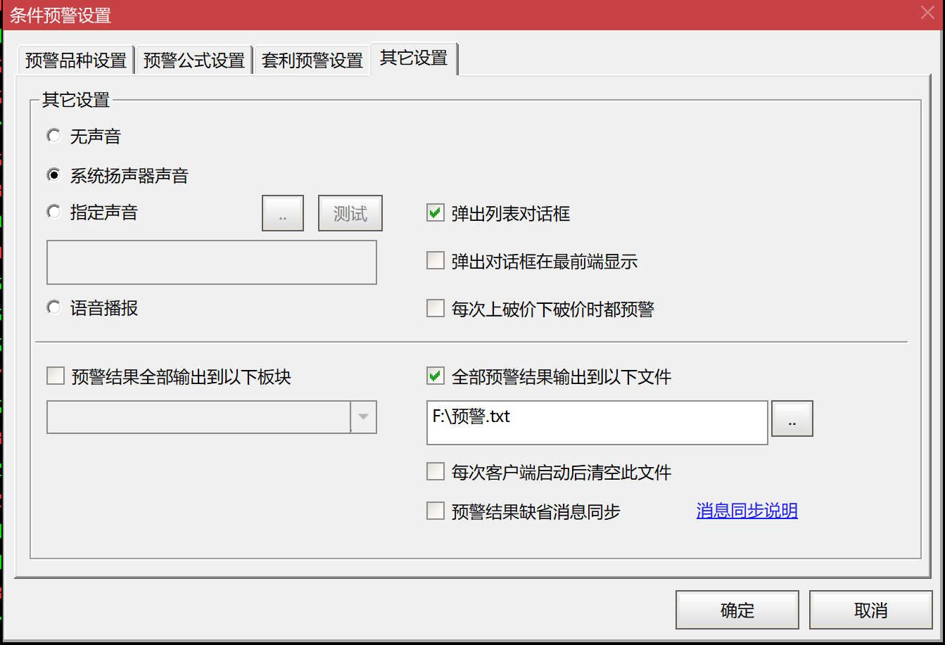 打开通达信→“功能”→“预警和复盘”→“条件预警设置”,记好保存路径(比如F:\预警.txt)。