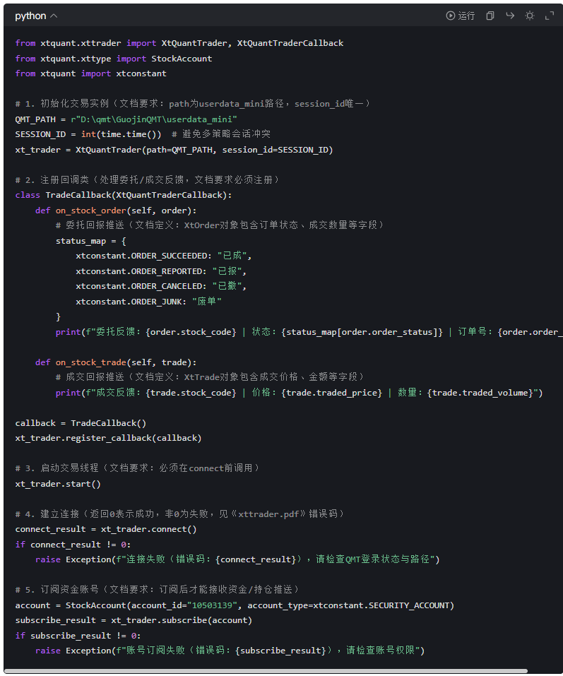 搭建完 Level2 数据源后,需通过 XtQuant 的交易接口(xttrader 模块)实现自动下单。QMT 交易接口分为 “系统设置接口”“操作接口”“查询接口” 三类,必须按顺序调用,否则会导致连接失败或下单异常。