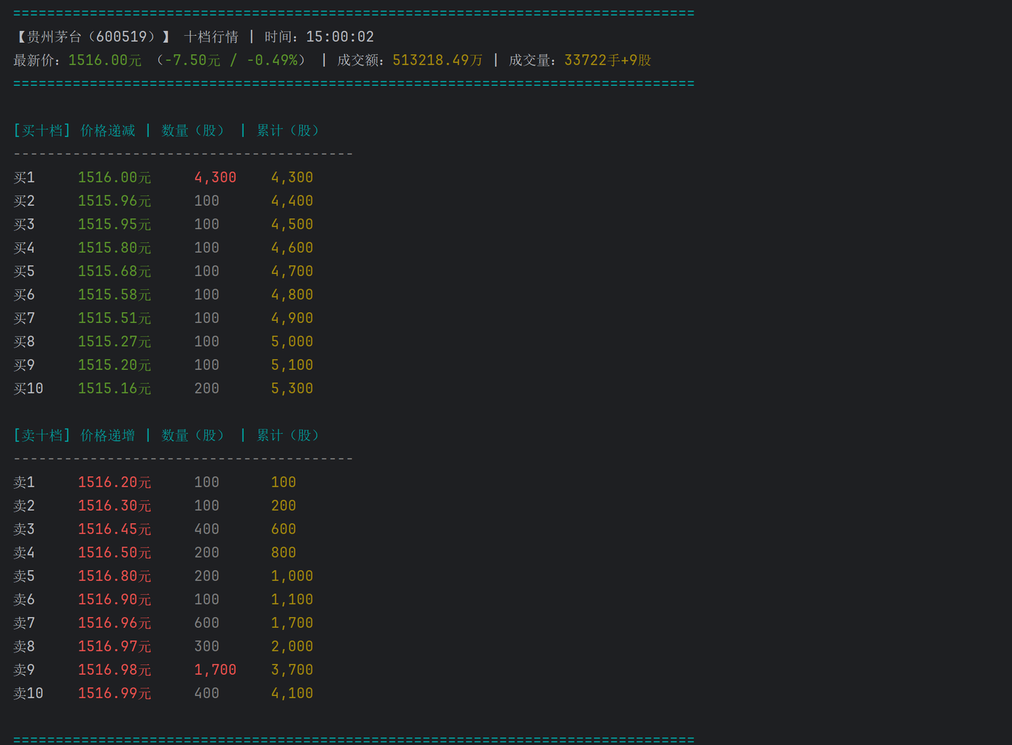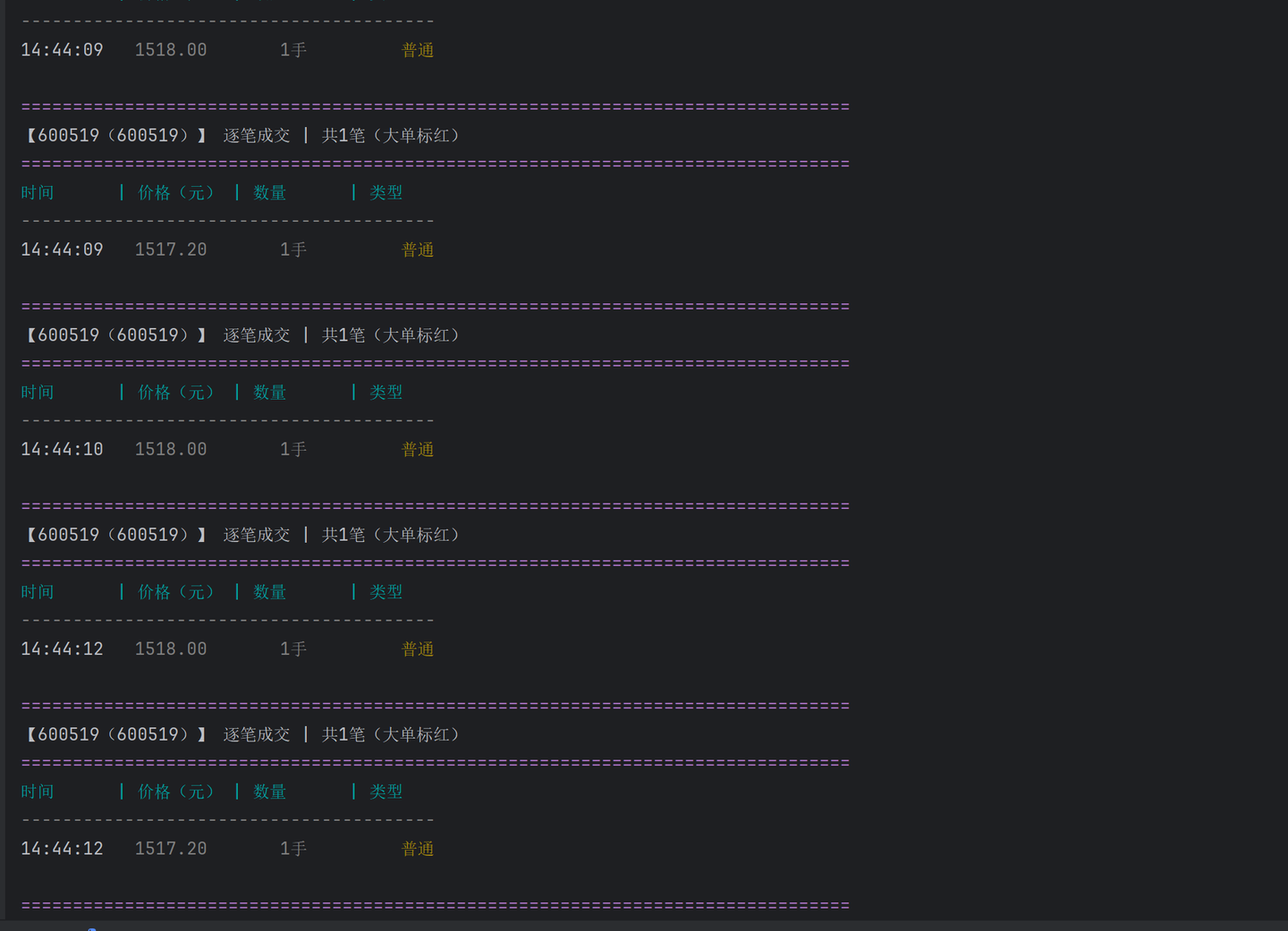 大单识别:通过volume字段设置阈值(如 1000 股),自动标记主力大单;