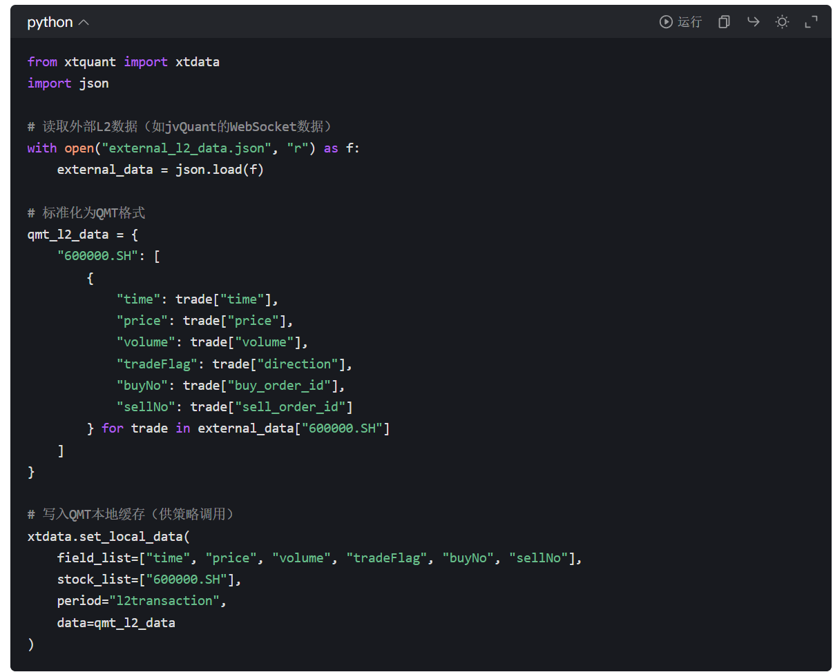 若需自定义数据格式(如对接 jvQuant、通达信等外部 L2 数据源),可通过 miniQMT 的xtdata模块接入,核心是将外部数据标准化为 QMT 兼容格式,再通过xttrader接口下单。