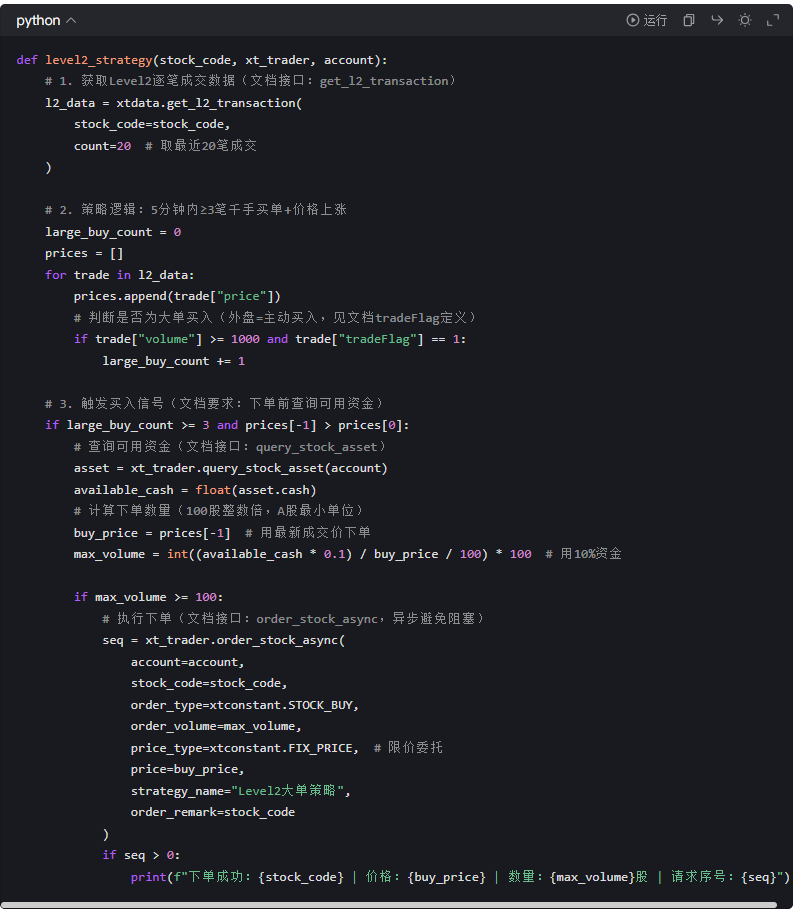 以 “大单突破策略” 为例,结合 Level2 逐笔成交数据触发下单,策略逻辑严格依赖l2transaction字段: