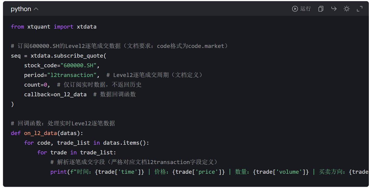 通过xtdata.subscribe_quote订阅 Level2 数据,需指定period为 Level2 专属周期(如l2transaction逐笔成交、l2order逐笔委托):